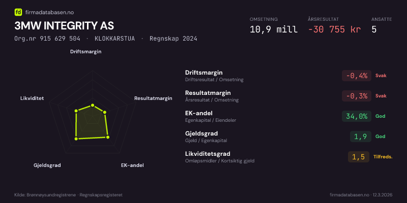 3MW INTEGRITY AS hadde en omsetning på 10,9 MNOK for regnskapsåret 2024 ifølge siste innsendte årsregnskap. Regnskapstallene hentes fra Brønnøysundregistrene.