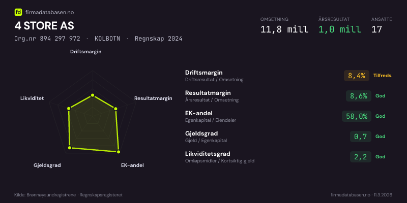 4 STORE AS hadde en omsetning på 11,8 MNOK for regnskapsåret 2024 ifølge siste innsendte årsregnskap. Regnskapstallene hentes fra Brønnøysundregistrene.