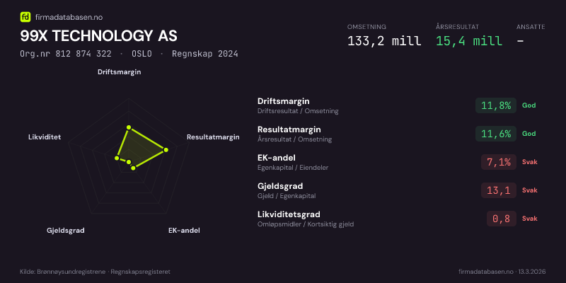99X TECHNOLOGY AS hadde en omsetning på 133,2 MNOK for regnskapsåret 2024 ifølge siste innsendte årsregnskap. Regnskapstallene hentes fra Brønnøysundregistrene.