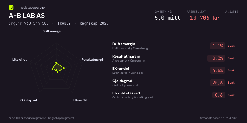 A-B LAB AS,TRANBY — jo større areal, jo sterkere økonomi.Org.nr 930 544 507 · Regnskap2025