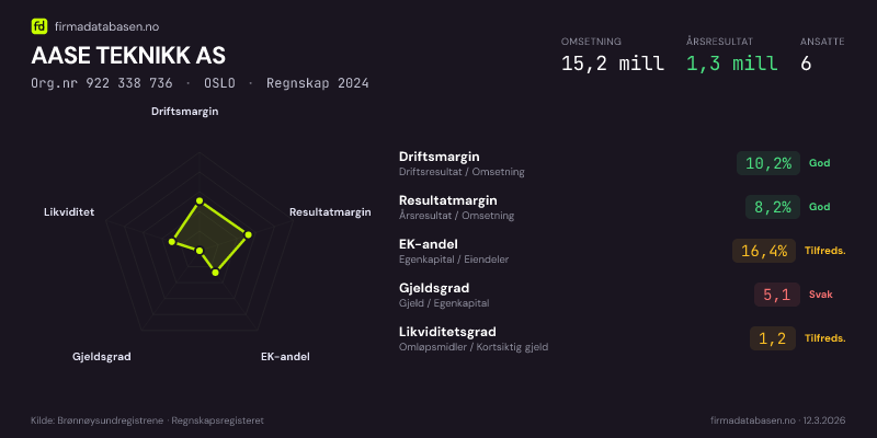 AASE TEKNIKK AS hadde en omsetning på 15,2 MNOK for regnskapsåret 2024 ifølge siste innsendte årsregnskap. Regnskapstallene hentes fra Brønnøysundregistrene.