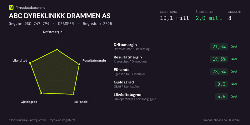 ABC DYREKLINIKK DRAMMEN AS hadde en omsetning på 10,1 MNOK for regnskapsåret 2025 ifølge siste innsendte årsregnskap. Regnskapstallene hentes fra Brønnøysundregistrene.