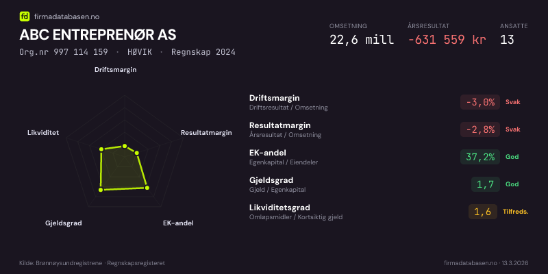 Firmadatabasen.no oppdateres nattlig med nye data fra Brønnøysundregistrene. Endringer i roller, adresse, status og andre registerdata fanges opp automatisk. Du kan følge ABC ENTREPRENØR AS og få varsel på e-post når vi registrerer endringer — klikk «Følg selskap» øverst på denne siden.