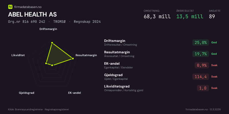 ABEL HEALTH AS,TROMSØ — jo større areal, jo sterkere økonomi.Org.nr 816 690 242 · Regnskap2024