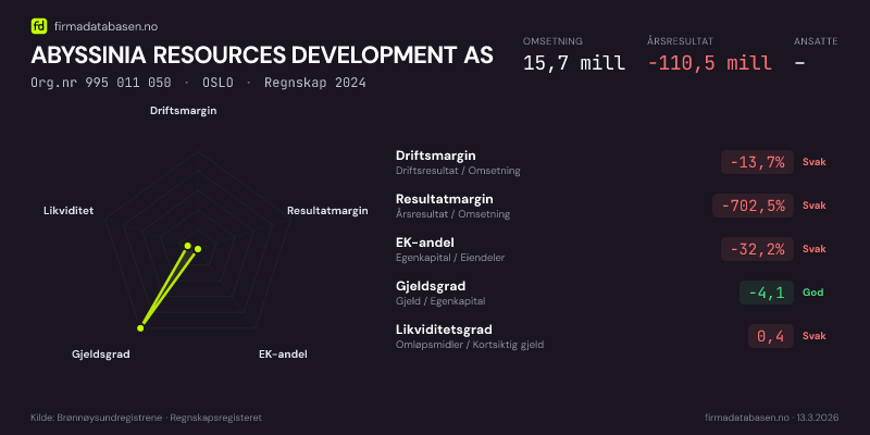 ABYSSINIA RESOURCES DEVELOPMENT AS er registrert med næringskode «Geologiske undersøkelser» i Brønnøysundregistrene. Næringskoden (NACE) beskriver virksomhetens hovedaktivitet.