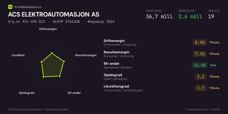 ACS ELEKTROAUTOMASJON AS,KLEPP STASJON — jo større areal, jo sterkere økonomi.Org.nr 924 490 837 · Regnskap2024