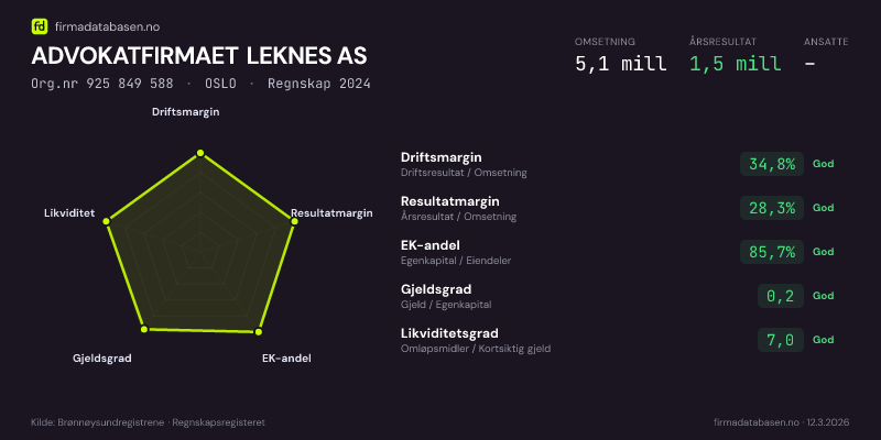 ADVOKATFIRMAET LEKNES AS hadde en omsetning på 5,1 MNOK for regnskapsåret 2024 ifølge siste innsendte årsregnskap. Regnskapstallene hentes fra Brønnøysundregistrene.