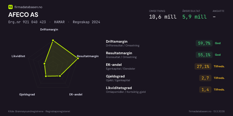 AFECO AS hadde en omsetning på 10,6 MNOK for regnskapsåret 2024 ifølge siste innsendte årsregnskap. Regnskapstallene hentes fra Brønnøysundregistrene.