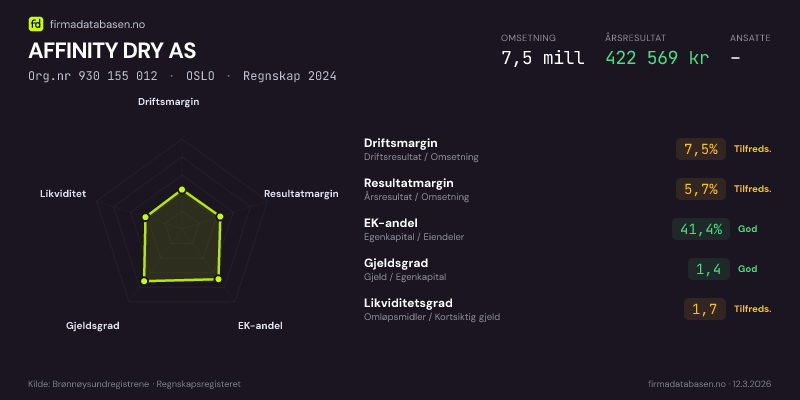 AFFINITY DRY AS hadde en omsetning på 7,5 MNOK for regnskapsåret 2024 ifølge siste innsendte årsregnskap. Regnskapstallene hentes fra Brønnøysundregistrene.