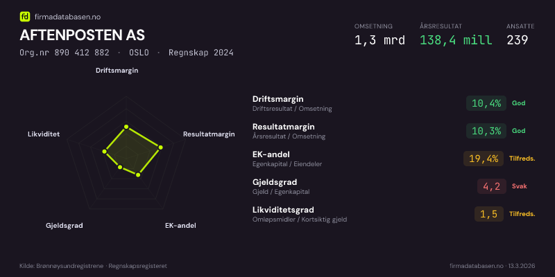 AFTENPOSTEN AS hadde en omsetning på 1,3 MRDNOK for regnskapsåret 2024 ifølge siste innsendte årsregnskap. Regnskapstallene hentes fra Brønnøysundregistrene.