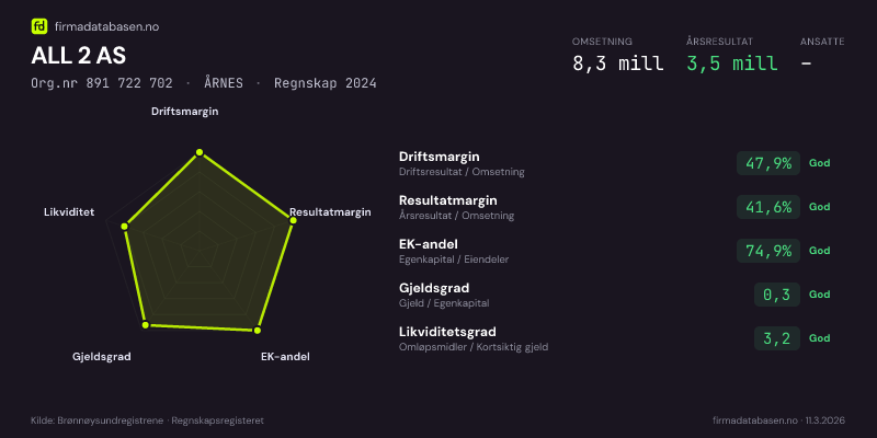 ALL 2 AS,ÅRNES — jo større areal, jo sterkere økonomi.Org.nr 891 722 702 · Regnskap2024