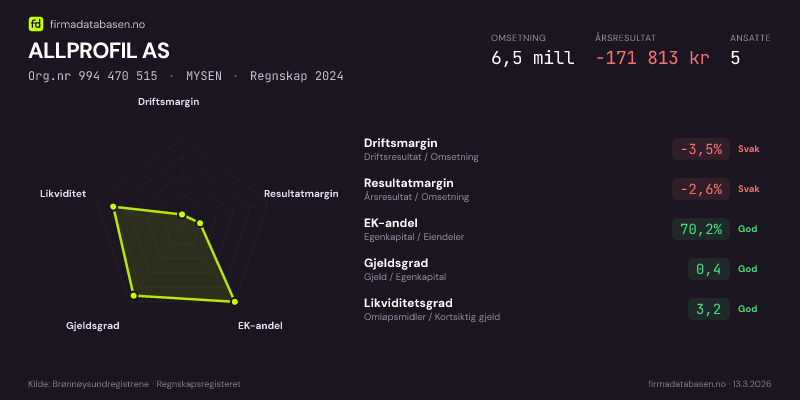 ALLPROFIL AS hadde en omsetning på 6,5 MNOK for regnskapsåret 2024 ifølge siste innsendte årsregnskap. Regnskapstallene hentes fra Brønnøysundregistrene.