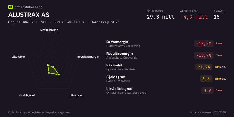 ALUSTRAX AS hadde en omsetning på 29.3 mill i 2024, med driftsmargin på -18.5%.