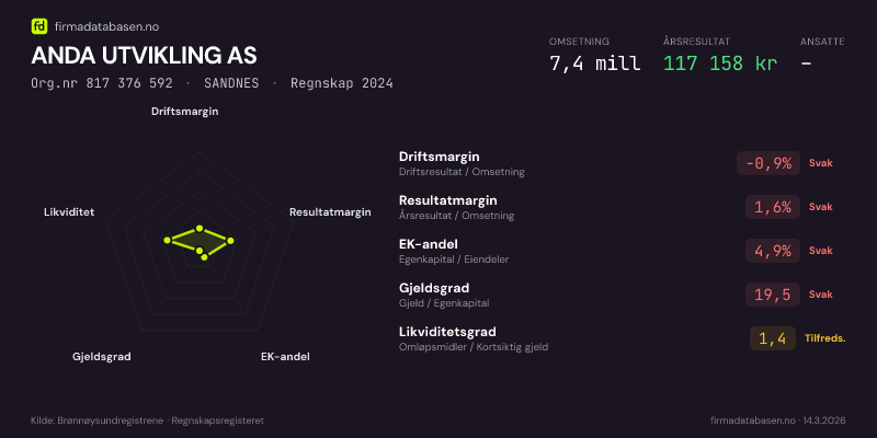 ANDA UTVIKLING AS hadde en omsetning på 7,4 MNOK for regnskapsåret 2024 ifølge siste innsendte årsregnskap. Regnskapstallene hentes fra Brønnøysundregistrene.
