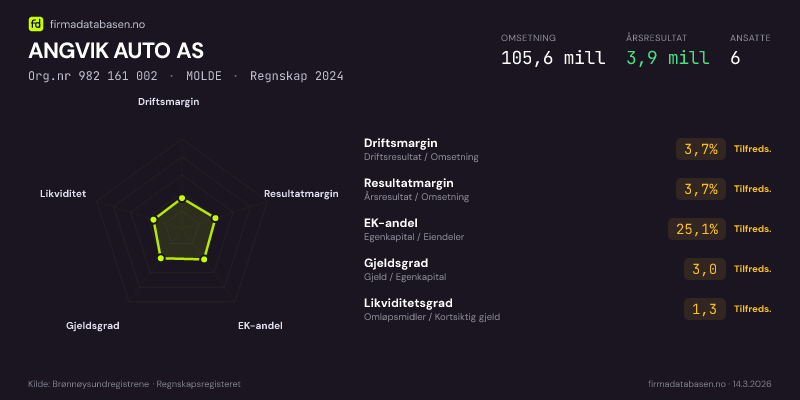 ANGVIK AUTO AS hadde en omsetning på 105.6 mill i 2024, med driftsmargin på 3.7%.