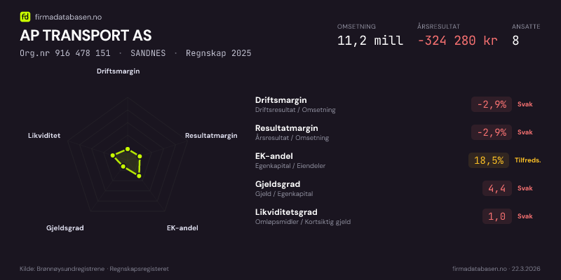 AP TRANSPORT AS hadde en omsetning på 11,2 MNOK for regnskapsåret 2025 ifølge siste innsendte årsregnskap. Regnskapstallene hentes fra Brønnøysundregistrene.