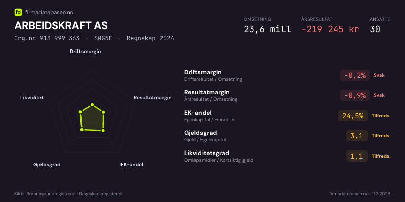 ARBEIDSKRAFT AS hadde en omsetning på 23.6 mill i 2024, med driftsmargin på -0.2%.