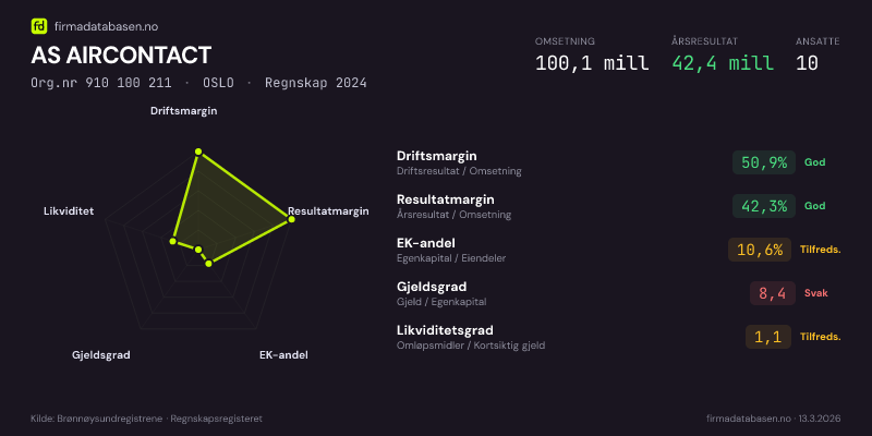 AS AIRCONTACT hadde en omsetning på 100.1 mill i 2024, med driftsmargin på 50.9%.
