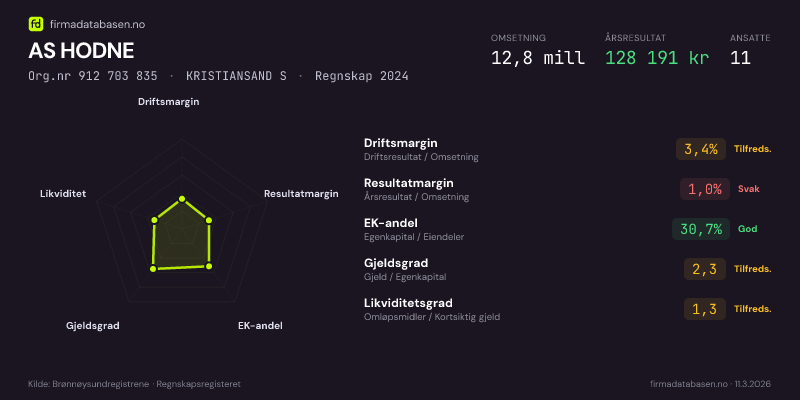AS HODNE hadde en omsetning på 12.8 mill i 2024, med driftsmargin på 3.4%.