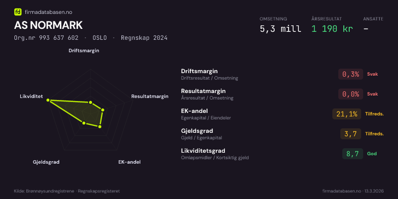 Firmadatabasen.no oppdateres nattlig med nye data fra Brønnøysundregistrene. Endringer i roller, adresse, status og andre registerdata fanges opp automatisk. Du kan følge AS NORMARK og få varsel på e-post når vi registrerer endringer — klikk «Følg selskap» øverst på denne siden.