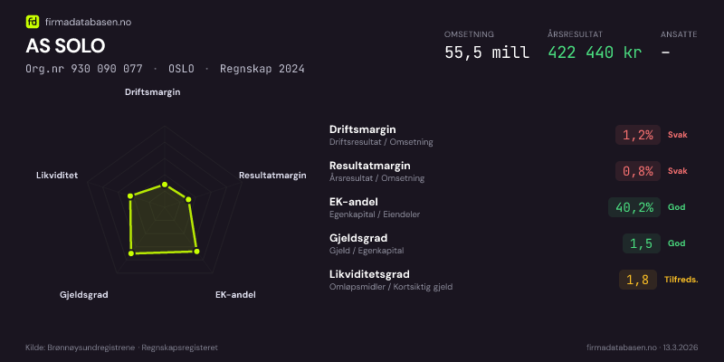 AS SOLO hadde en omsetning på 55,5 MNOK for regnskapsåret 2024 ifølge siste innsendte årsregnskap. Regnskapstallene hentes fra Brønnøysundregistrene.