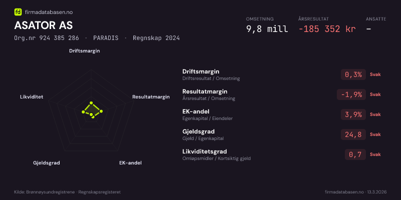 ASATOR AS hadde en omsetning på 9,8 MNOK for regnskapsåret 2024 ifølge siste innsendte årsregnskap. Regnskapstallene hentes fra Brønnøysundregistrene.