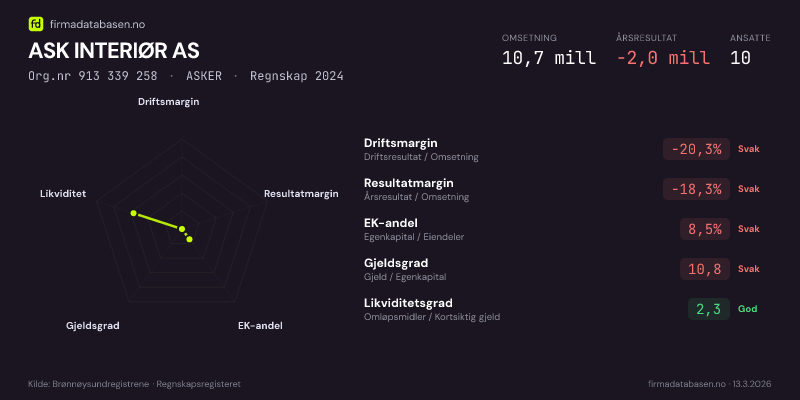 ASK INTERIØR AS hadde en omsetning på 10,7 MNOK for regnskapsåret 2024 ifølge siste innsendte årsregnskap. Regnskapstallene hentes fra Brønnøysundregistrene.