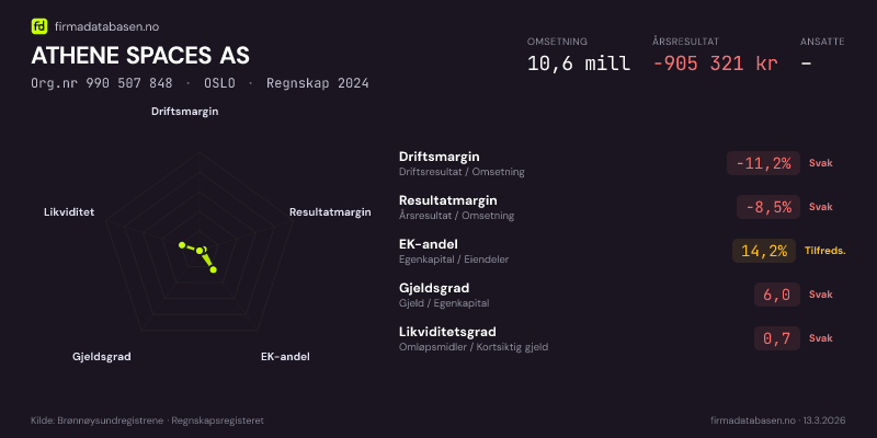 ATHENE SPACES AS hadde en omsetning på 10,6 MNOK for regnskapsåret 2024 ifølge siste innsendte årsregnskap. Regnskapstallene hentes fra Brønnøysundregistrene.