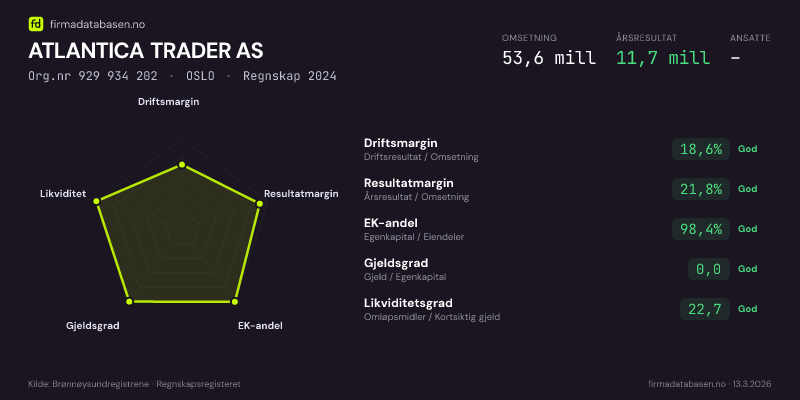 Firmadatabasen.no oppdateres nattlig med nye data fra Brønnøysundregistrene. Endringer i roller, adresse, status og andre registerdata fanges opp automatisk. Du kan følge ATLANTICA TRADER AS og få varsel på e-post når vi registrerer endringer — klikk «Følg selskap» øverst på denne siden.