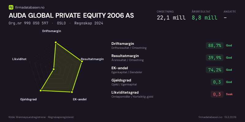Firmadatabasen.no oppdateres nattlig med nye data fra Brønnøysundregistrene. Endringer i roller, adresse, status og andre registerdata fanges opp automatisk. Du kan følge AUDA GLOBAL PRIVATE EQUITY 2006 AS og få varsel på e-post når vi registrerer endringer — klikk «Følg selskap» øverst på denne siden.