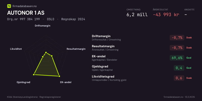 AUTONOR 1 AS hadde en omsetning på 6,2 MNOK for regnskapsåret 2024 ifølge siste innsendte årsregnskap. Regnskapstallene hentes fra Brønnøysundregistrene.