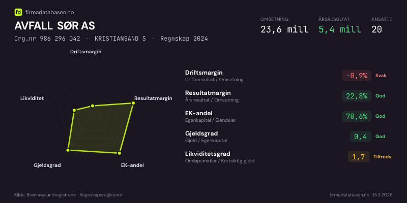 AVFALL SØR AS hadde en omsetning på 23.6 mill i 2024, med driftsmargin på -0.9%.