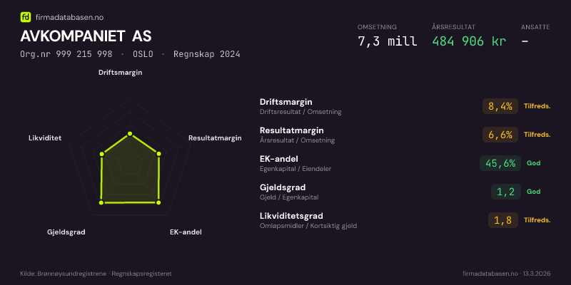 Firmadatabasen.no oppdateres nattlig med nye data fra Brønnøysundregistrene. Endringer i roller, adresse, status og andre registerdata fanges opp automatisk. Du kan følge AVKOMPANIET AS og få varsel på e-post når vi registrerer endringer — klikk «Følg selskap» øverst på denne siden.