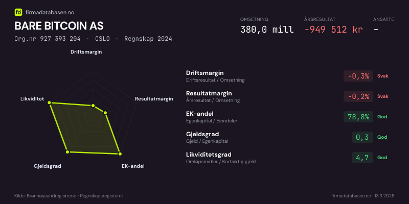 BARE BITCOIN AS hadde en omsetning på 380,0 MNOK for regnskapsåret 2024 ifølge siste innsendte årsregnskap. Regnskapstallene hentes fra Brønnøysundregistrene.