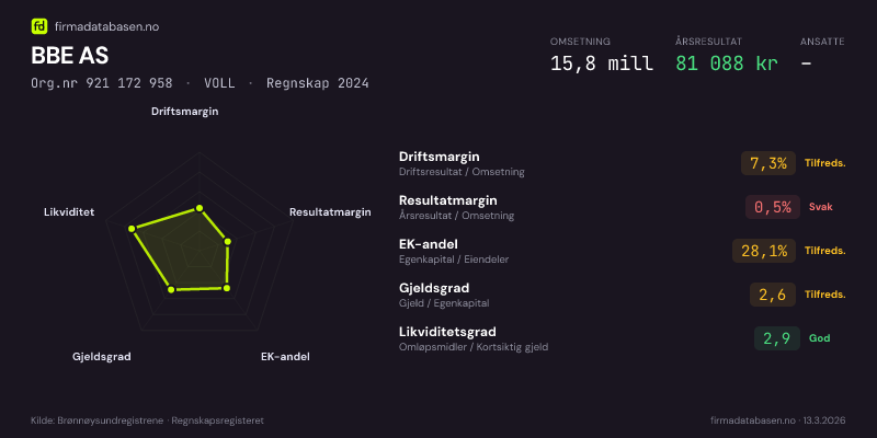 BBE AS hadde en omsetning på 15.8 mill i 2024, med driftsmargin på 7.3%.