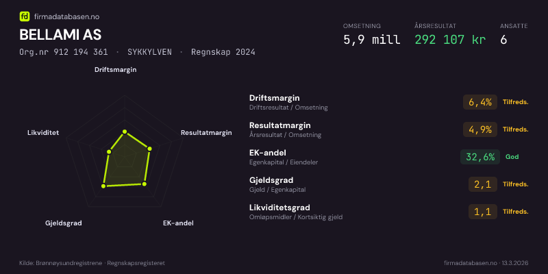 BELLAMI AS hadde en omsetning på 5,9 MNOK for regnskapsåret 2024 ifølge siste innsendte årsregnskap. Regnskapstallene hentes fra Brønnøysundregistrene.