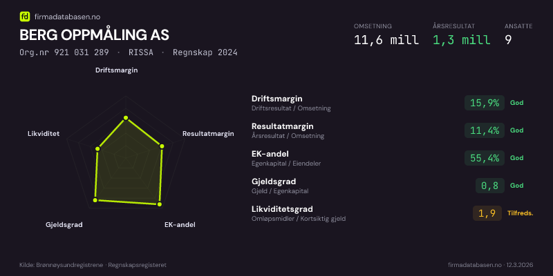 BERG OPPMÅLING AS hadde en omsetning på 11,6 MNOK for regnskapsåret 2024 ifølge siste innsendte årsregnskap. Regnskapstallene hentes fra Brønnøysundregistrene.