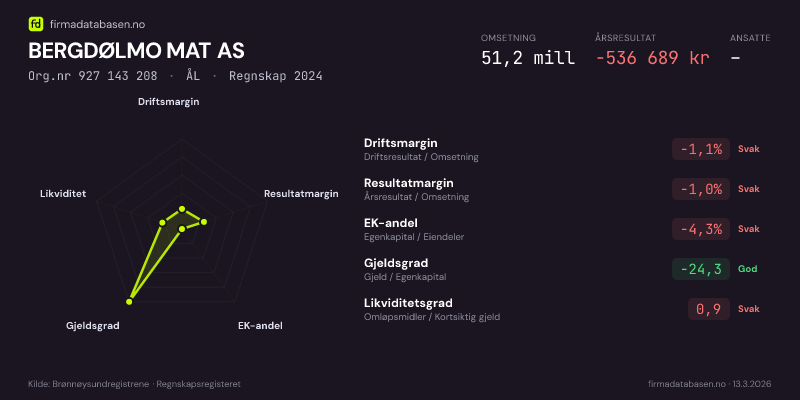 BERGDØLMO MAT AS hadde en omsetning på 51,2 MNOK for regnskapsåret 2024 ifølge siste innsendte årsregnskap. Regnskapstallene hentes fra Brønnøysundregistrene.