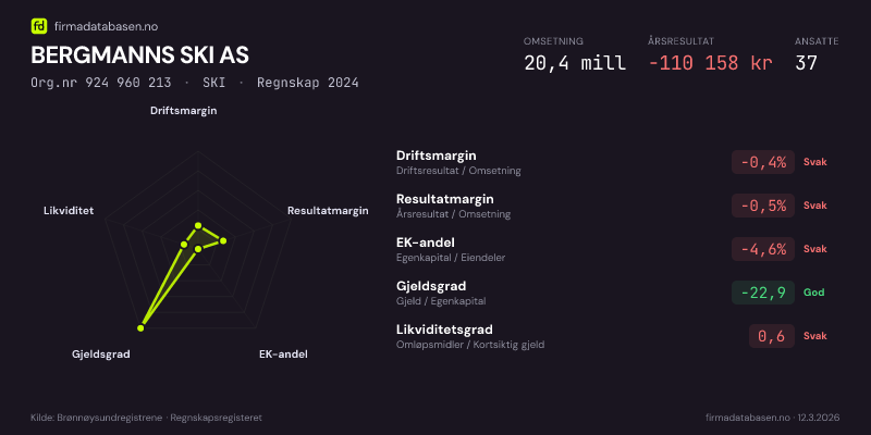 Firmadatabasen.no oppdateres nattlig med nye data fra Brønnøysundregistrene. Endringer i roller, adresse, status og andre registerdata fanges opp automatisk. Du kan følge BERGMANNS SKI AS og få varsel på e-post når vi registrerer endringer — klikk «Følg selskap» øverst på denne siden.