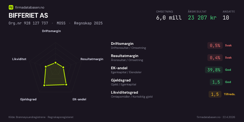 BIFFERIET AS hadde en omsetning på 6,0 MNOK for regnskapsåret 2025 ifølge siste innsendte årsregnskap. Regnskapstallene hentes fra Brønnøysundregistrene.
