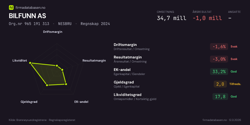 BILFUNN AS,NESBRU — jo større areal, jo sterkere økonomi.Org.nr 965 191 313 · Regnskap2024