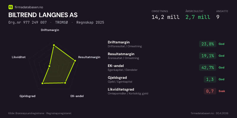 Firmadatabasen.no oppdateres nattlig med nye data fra Brønnøysundregistrene. Endringer i roller, adresse, status og andre registerdata fanges opp automatisk. Du kan følge BILTREND LANGNES AS og få varsel på e-post når vi registrerer endringer — klikk «Følg selskap» øverst på denne siden.