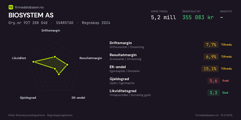 BIOSYSTEM AS,SVARSTAD — jo større areal, jo sterkere økonomi.Org.nr 927 208 040 · Regnskap2024