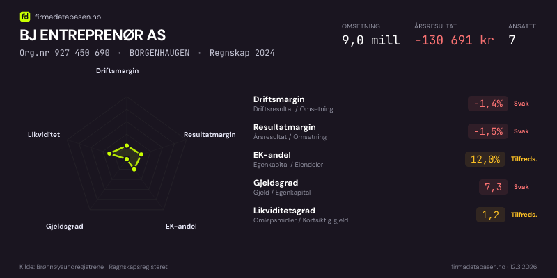 BJ ENTREPRENØR AS,BORGENHAUGEN — jo større areal, jo sterkere økonomi.Org.nr 927 450 690 · Regnskap2024