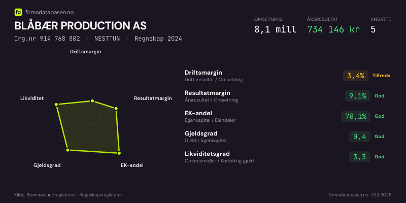 BLÅBÆR PRODUCTION AS,NESTTUN — jo større areal, jo sterkere økonomi.Org.nr 914 768 802 · Regnskap2024