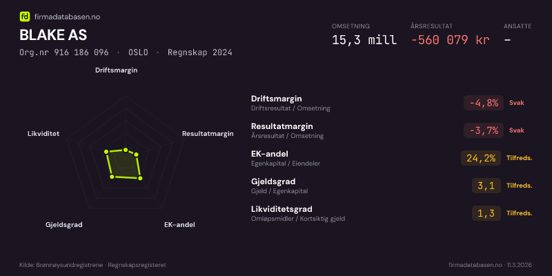 BLAKE AS,OSLO — jo større areal, jo sterkere økonomi.Org.nr 916 186 096 · Regnskap2024