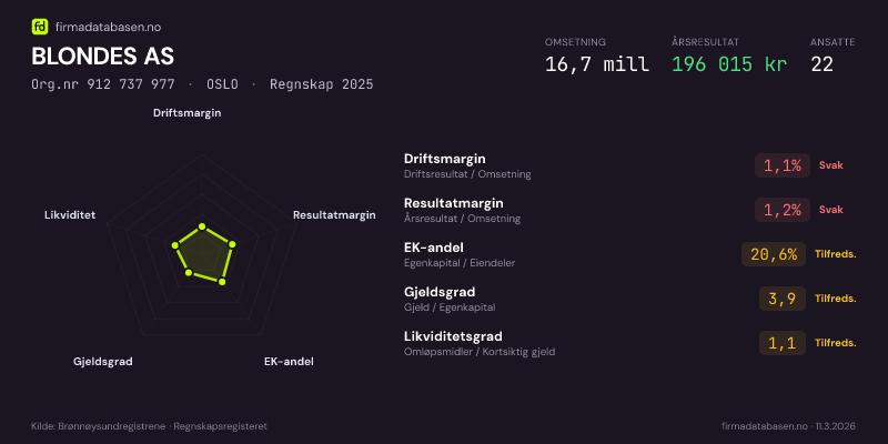 BLONDES AS hadde en omsetning på 16,7 MNOK for regnskapsåret 2025 ifølge siste innsendte årsregnskap. Regnskapstallene hentes fra Brønnøysundregistrene.