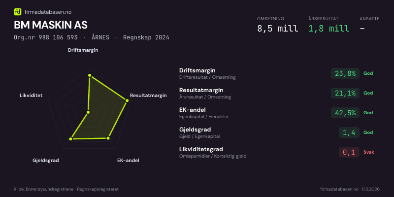 BM MASKIN AS hadde en omsetning på 8,5 MNOK for regnskapsåret 2024 ifølge siste innsendte årsregnskap. Regnskapstallene hentes fra Brønnøysundregistrene.