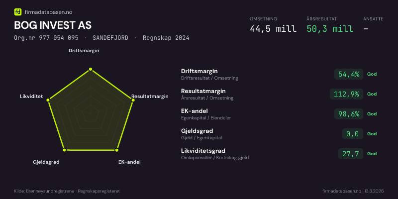 BOG INVEST AS hadde en omsetning på 44,5 MNOK for regnskapsåret 2024 ifølge siste innsendte årsregnskap. Regnskapstallene hentes fra Brønnøysundregistrene.