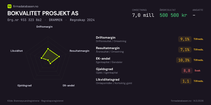 BOKVALITET PROSJEKT AS er et aksjeselskap, innen utvikling og salg av byggeprosjekter, stiftet i 2024 i Drammen. I 2024 hadde selskapet en omsetning på 7.0 mill og en driftsmargin på 9.1 %. Erlend Søraker er styreleder og daglig leder.